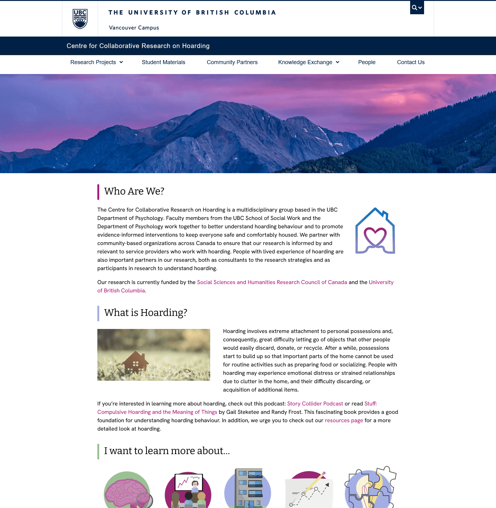 Researchers at the University of British Columbia Centre for Collaborative Research on Hoarding required a complete website redesign. This included the development of branding that was unique to the Centre yet still cohesive with UBC's own branding, a website prototype, custom iconography, and website creation using UBC's content management system (Wordpress).