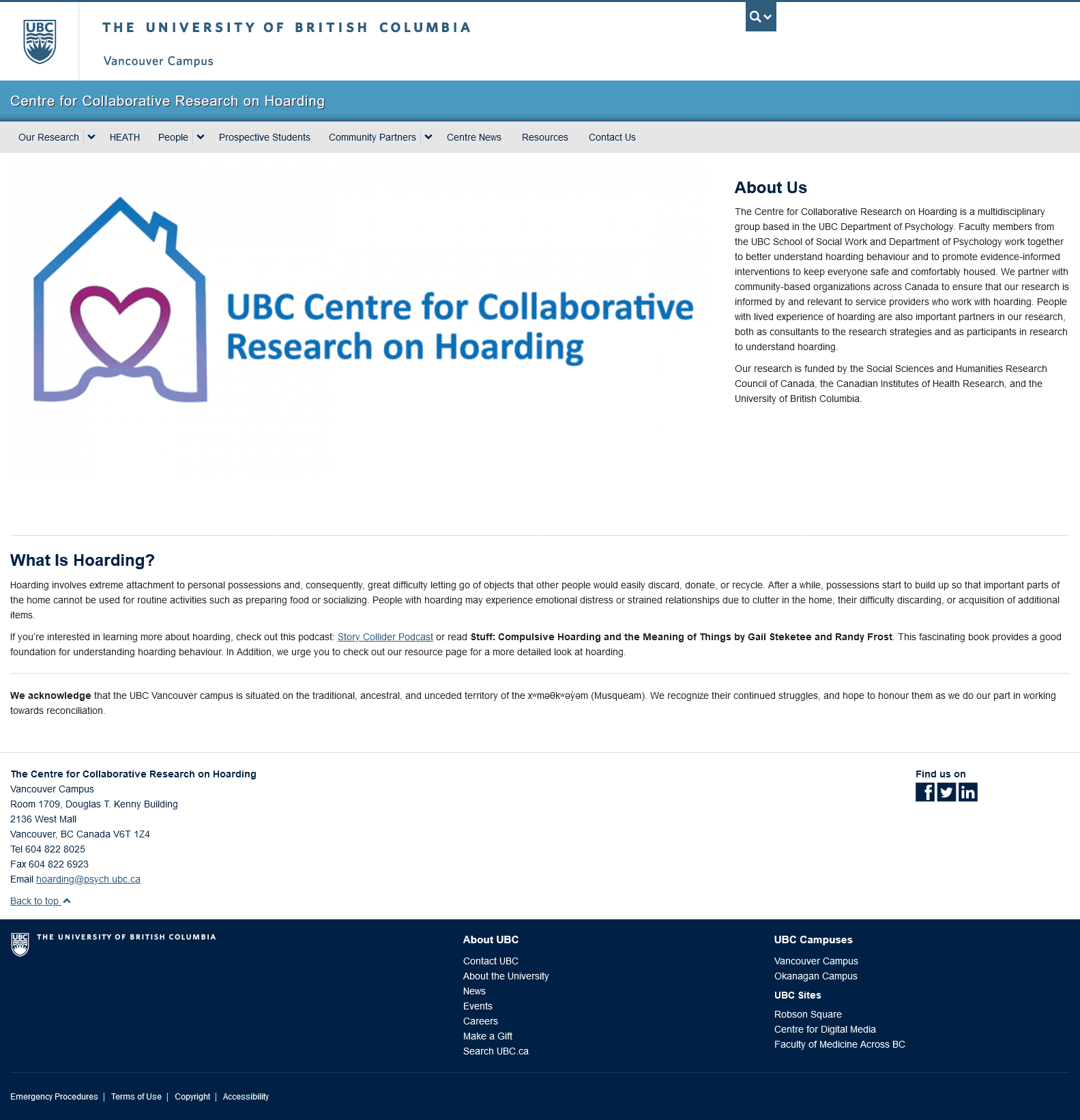 The Centre for Collaborative Research on Hoarding is a multidisciplinary research group based in the University of British Columbia's (UBC) Department of Psychology.